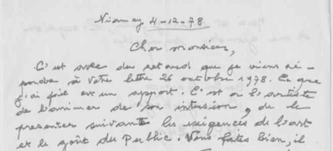 C’est une belle découverte que nous avons faite au sein des archives de l’Institut Mémoires de l’Édition Contemporaine (IMEC) : cinq lettres échangées entre le compositeur Jean-Louis Florentz et Boubou Hama, datées de 1977 à début 1979. Ces échanges chaleureux et empreints d’un profond respect, révèlent un dialogue entre deux hommes que la quête de sens, l’amour des cultures et une vision poétique du monde ont rapprochés.